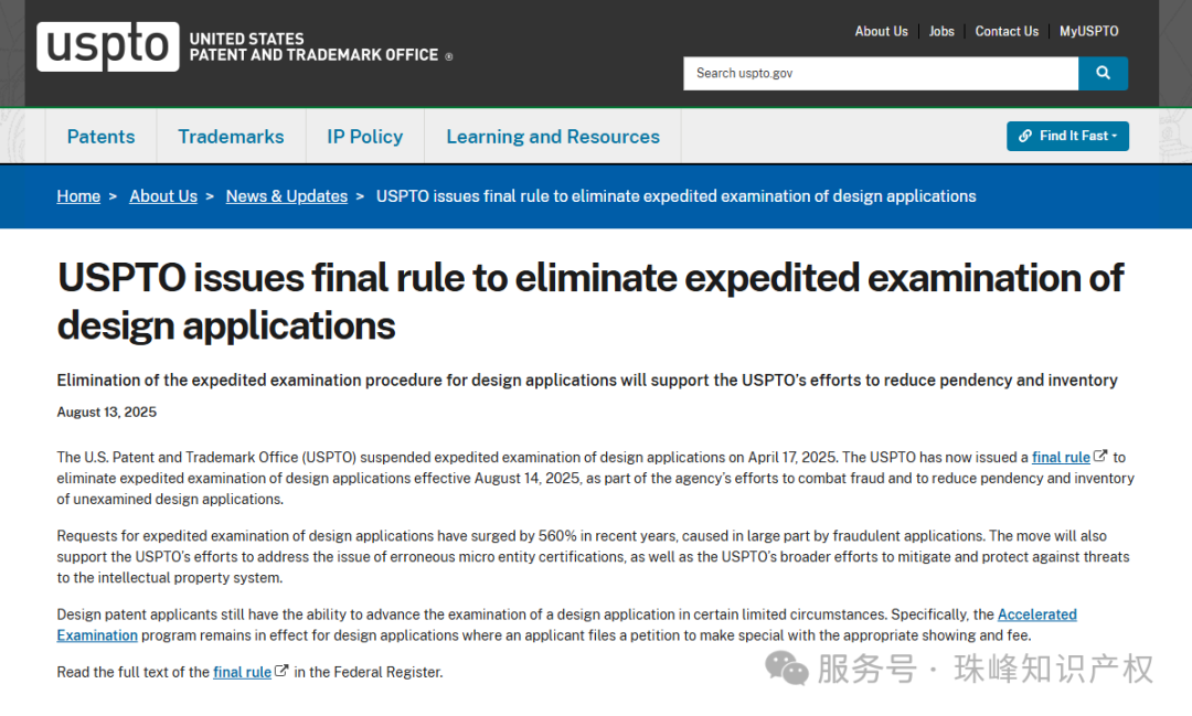 当地时间8月14日,美国专利商标局(USPTO)发布最终规则,正式取消外观设计专利申请的加速审查程序(Accelerated Examination)。这一决定并非突然,早在2025年4月17日,USPTO就已暂停该机制,如今则是彻底废止。